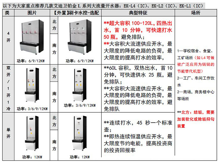 ----》iDIY步進式:節(jié)能EK-L2和EK-L4系列,大容積大流速供應開水,最大限度的降低電路的負荷,最大限度的提高打水的效率,避免排隊;經典產品:EK-B60IC 和 EK-B120L4IC(可附上重點產品特征)